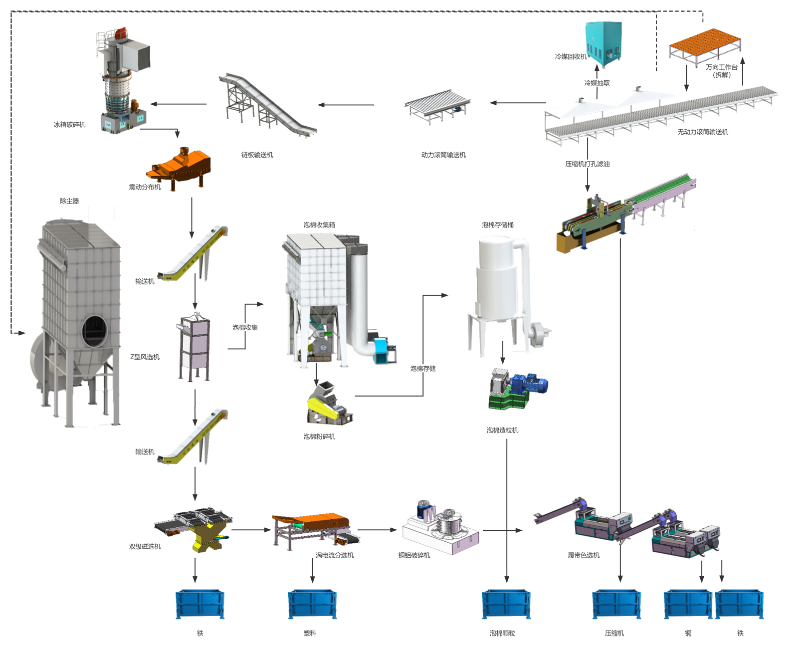 配套设备所有电气元件采用西门子/ABB/法国施耐德等进口品牌,配机电缆均采用国内一线品牌,符合国家强制标准。生产线分选铁回收率≥99.5%,塑料回收率≥98%,聚氨酯泡沫分选率≥97.8%。