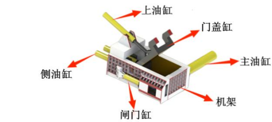 将所需打包之料装入压缩室内,首先动作盖缸,使盖板旋转直至封闭压缩室,锁紧机锁牢,接着侧油缸压头和主压头依次先后挤压,将料挤压成束块,主缸卸压,闸门缸前推,打开闸门,然后,主缸将压块推出料箱。门盖缸、侧油缸缸、主缸、闸门缸依次先后回程。束块之长短,决定于所挤压物料的重量、材质和形状。